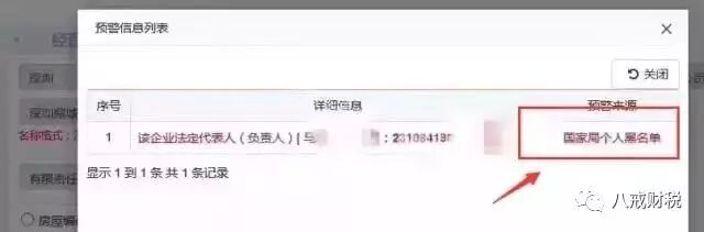 黑名单后之后再次注册公司时,填进去身份信息,就直接弹出预警“国家局黑名单”的情况!